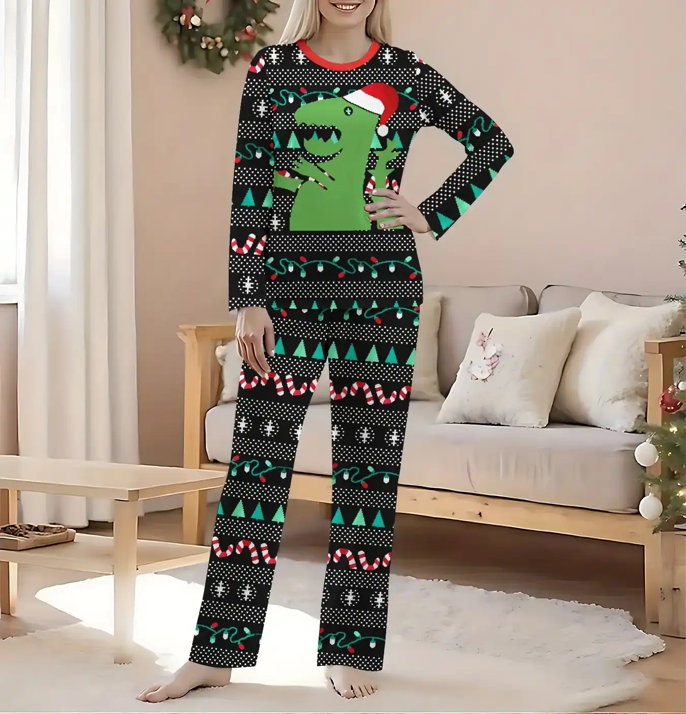 Black pajamas with green Santa dinosaur bring humor and warmth to your holiday season.