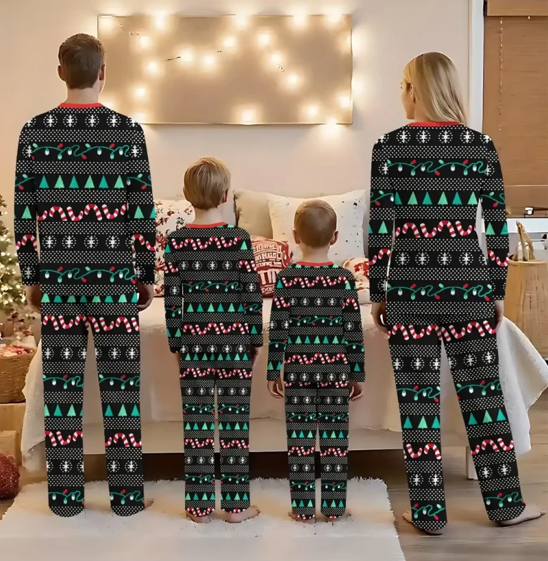 Featuring festive prints of candy canes, snowflakes, Christmas trees, and streamers, these matching family pajamas are perfect for Christmas photos, cozy nights, and gift-giving.