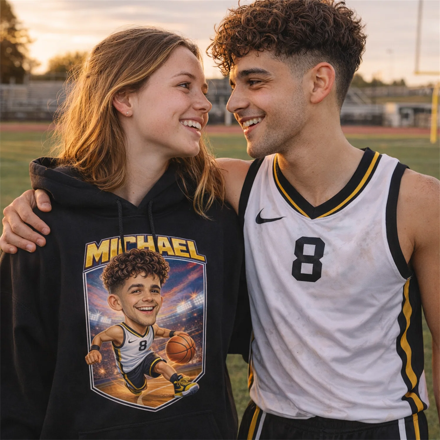 One custom illustration, three garments. Order the tee for warm gym days, the hoodie for cold arena mornings, or the crewneck sweatshirt for travel days to away games, all printed with the same bold personalized design.