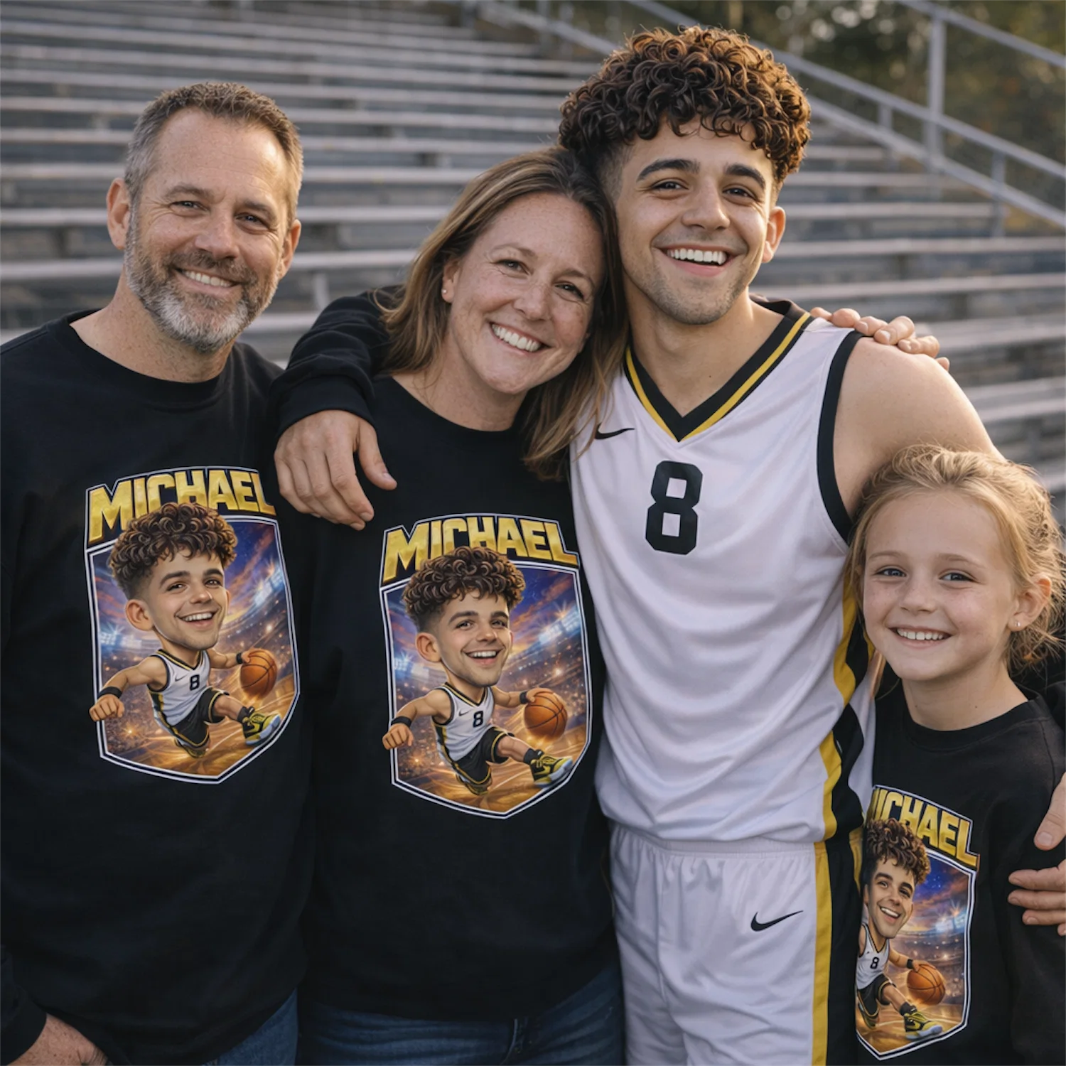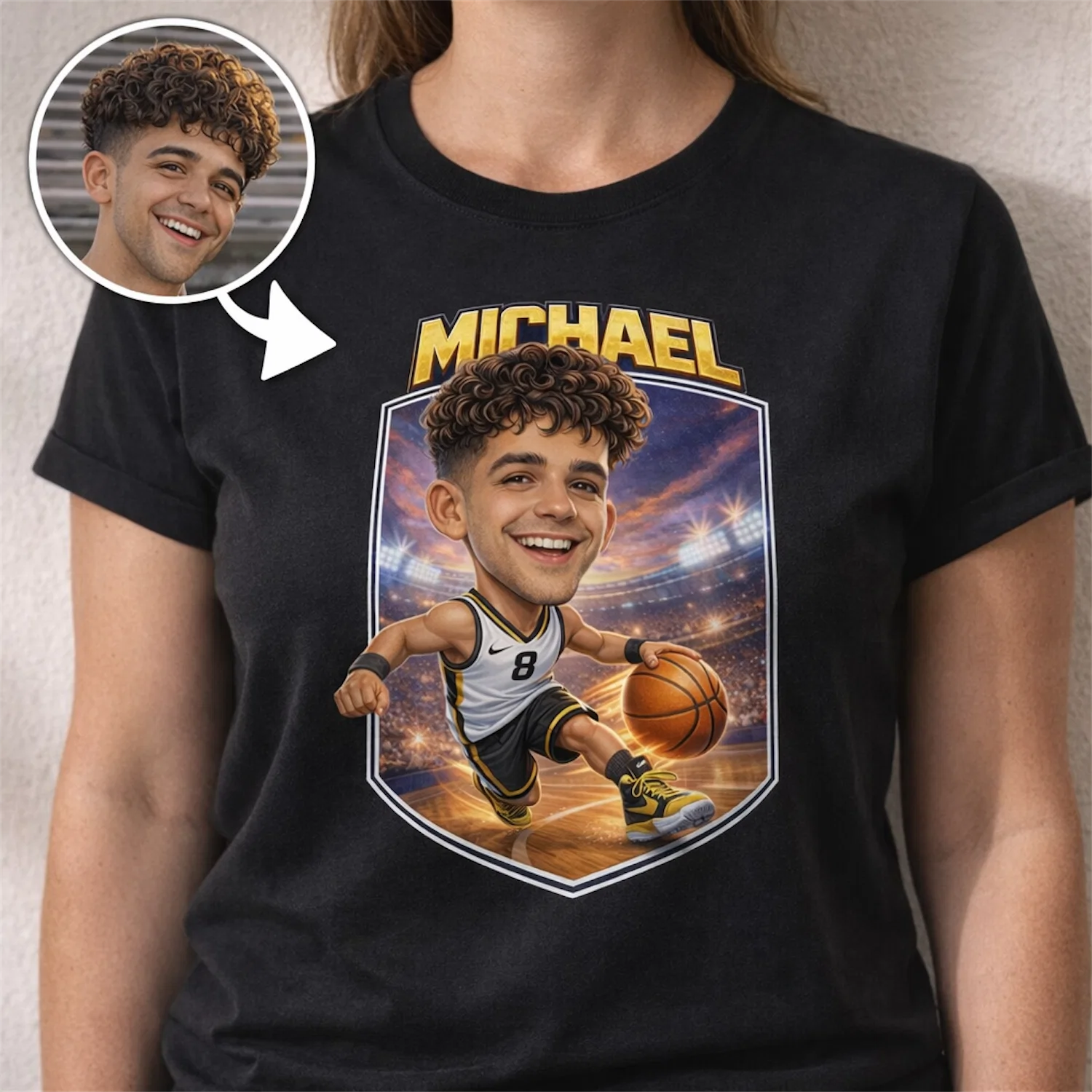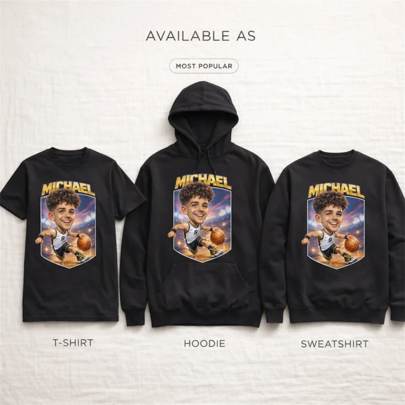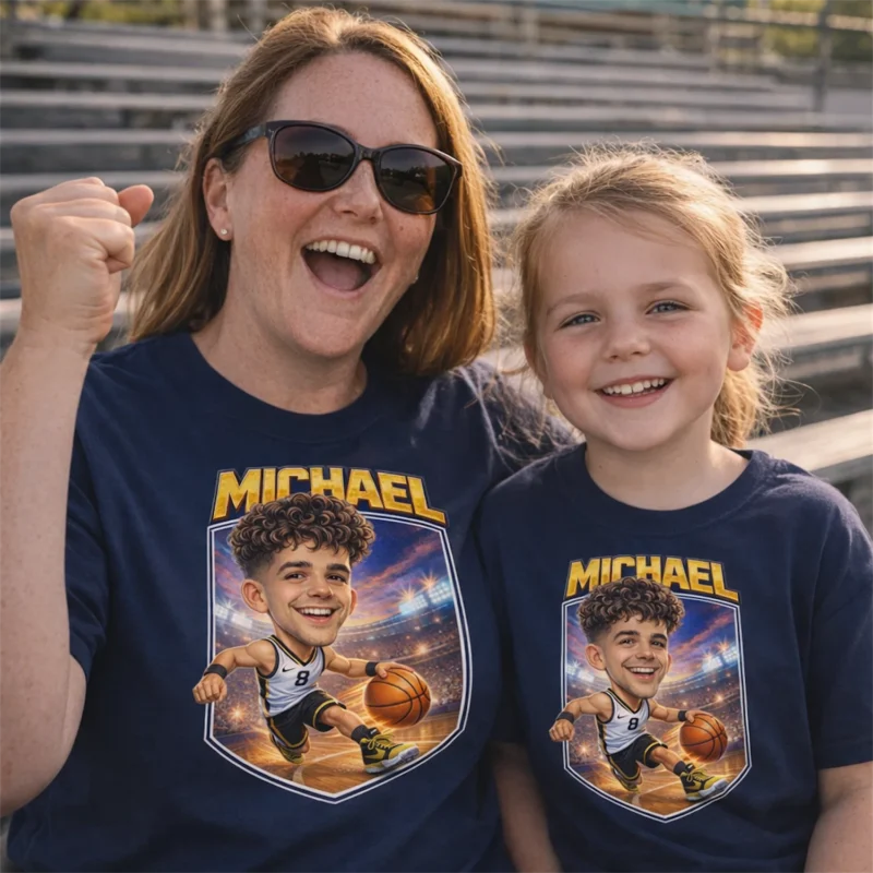 Your Face. Your Jersey Number. Your Cartoon Dunk. Personalized Basketball Caricature Matching T-Shirts for Players, Families & Fans.