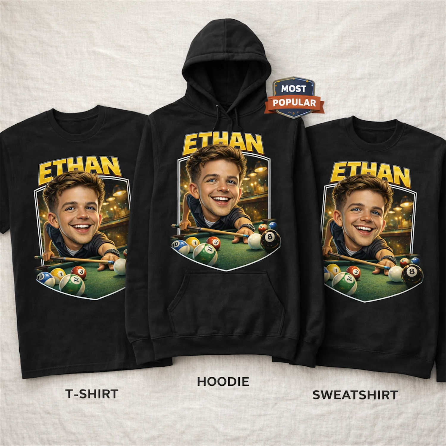 Upload a photo of any billiards player and we turn it into a bold, oversized caricature — cue in hand, stance ready, name and lucky number front and center — printed on a premium cotton t-shirt. Built for pool league teammates, tournament champions, and families who live for the game.