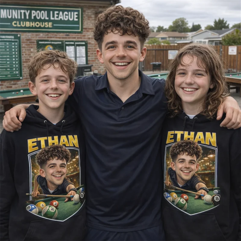 For dads and kids who share a basement table, a regular pool hall trip, or a Saturday night league together — matching caricature shirts turn that routine into something they’ll keep forever. Each shirt gets its own unique caricature from a separate photo, so every family member looks like themselves. The kind of gift that makes the next rack feel even more important.
