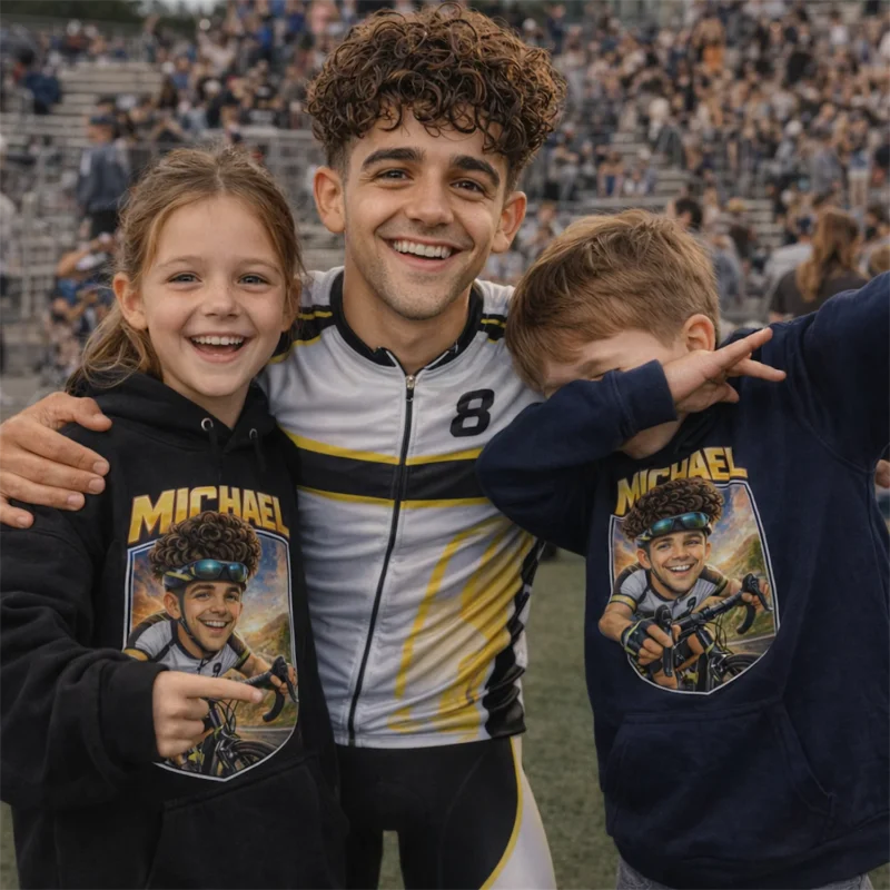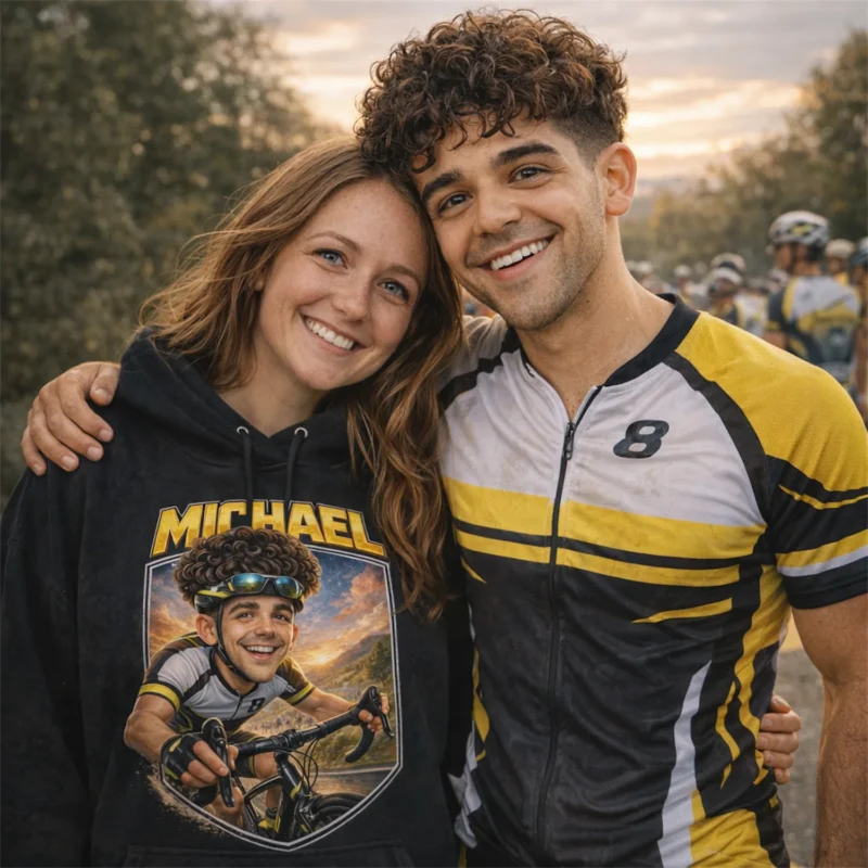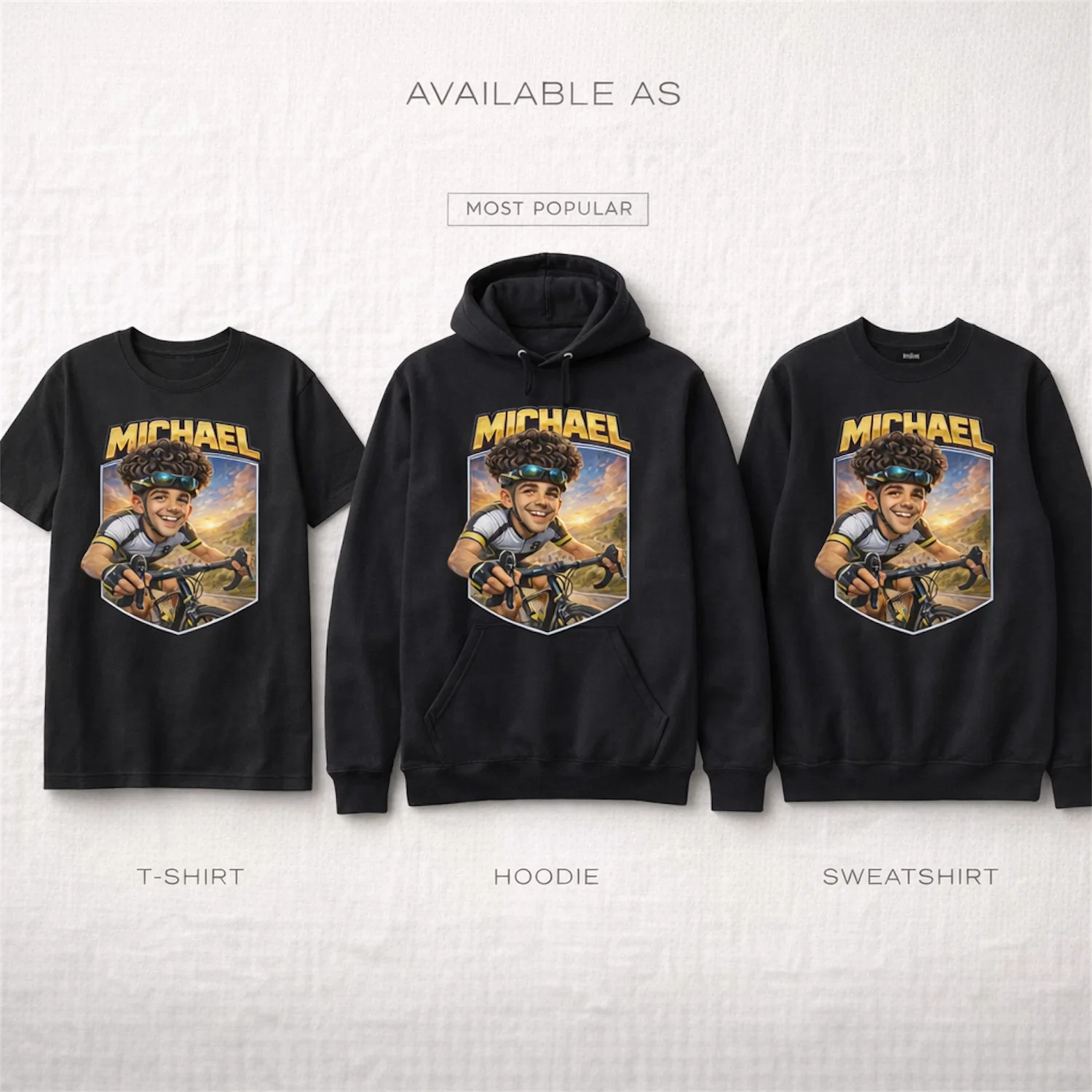 Your custom cycling caricature design transfers to any of three garment types. Choose the t-shirt for warm-weather rides and post-race hangs, the hoodie for cold morning coffee stops, or the crewneck sweatshirt for travel days between events.