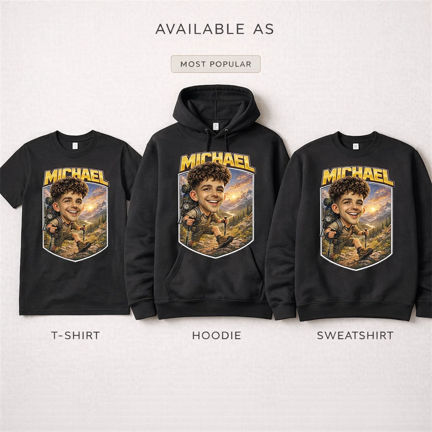 Your custom hiking caricature design is available on three garment styles — choose what fits the weather and the adventure. A light tee for summer trails, a fleece hoodie for cold mountain mornings, or a crewneck for everything in between.