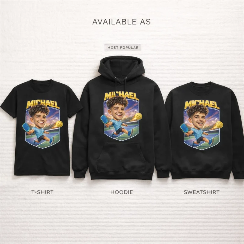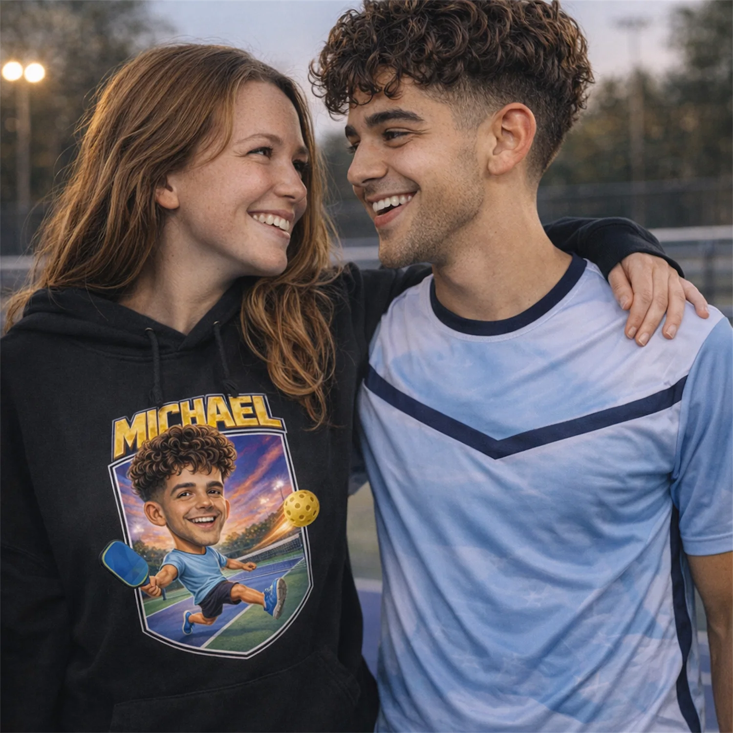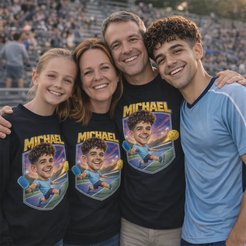 Your Face. Your Paddle. Your Winning Dink. Personalized Pickleball Caricature Matching T-Shirts for Players, Families & Court Crews.