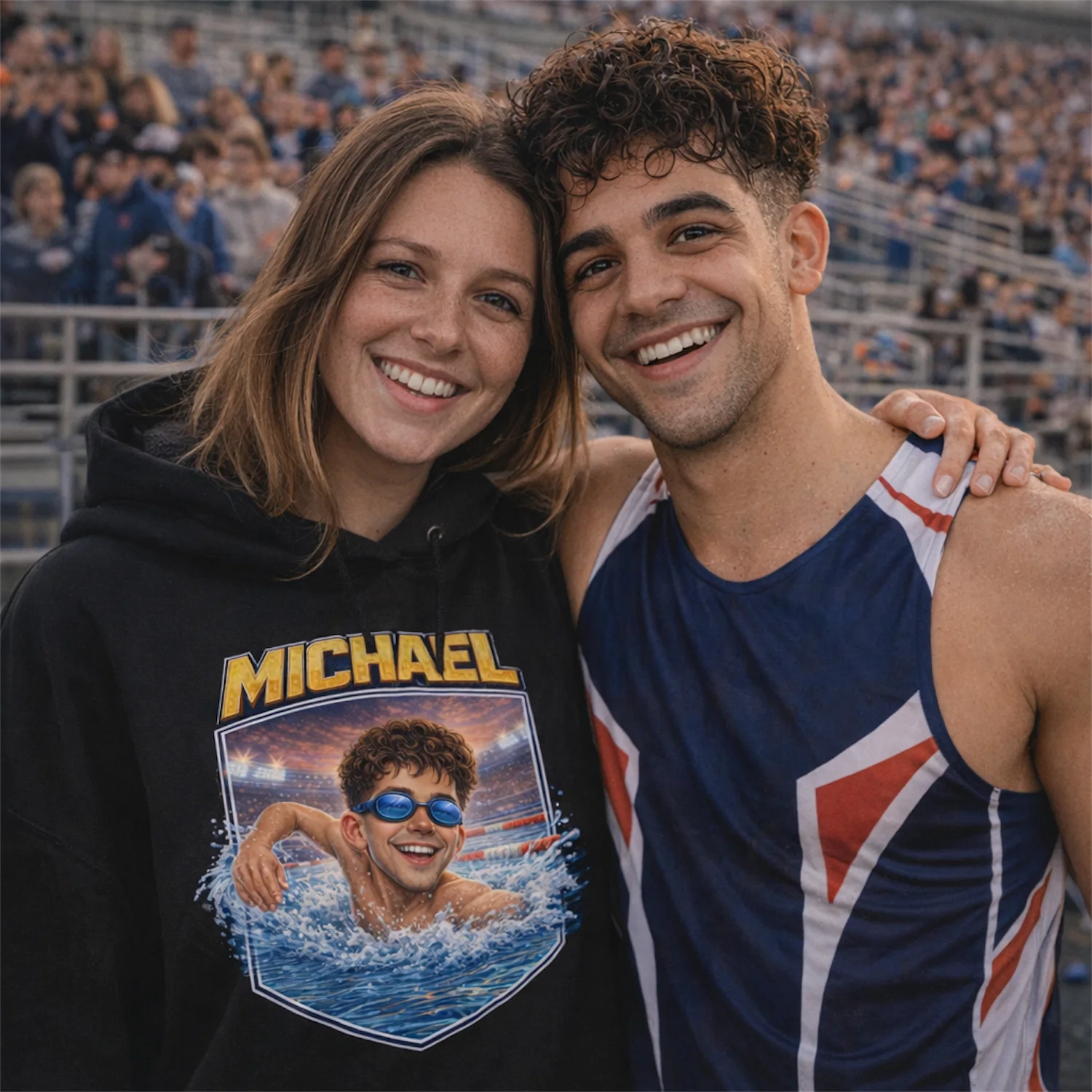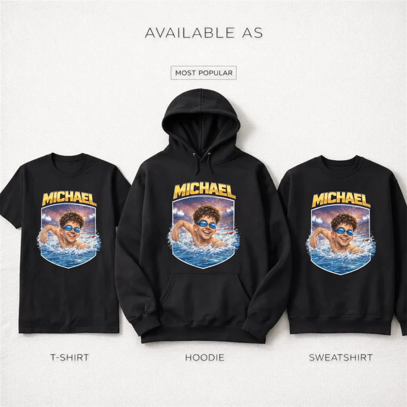 One custom illustration, three garments. Order the tee for warm indoor meets and banquet nights, the hoodie for those frigid outdoor swim meets and early-morning deck warmups, or the crewneck sweatshirt for long bus rides to away invitationals — all printed with the same bold personalized design.