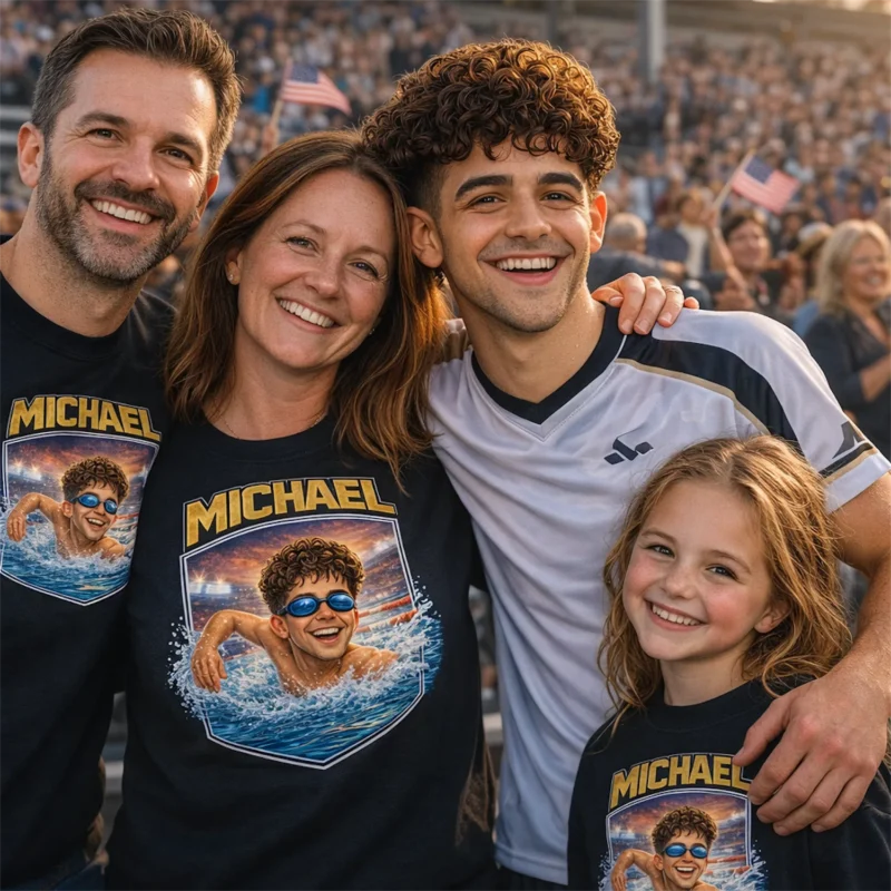 Your Swimmer. Their Lane. Their Podium Moment. Personalized Swimming Caricature Matching T-Shirts for Swimmers, Families & Swim Teams.