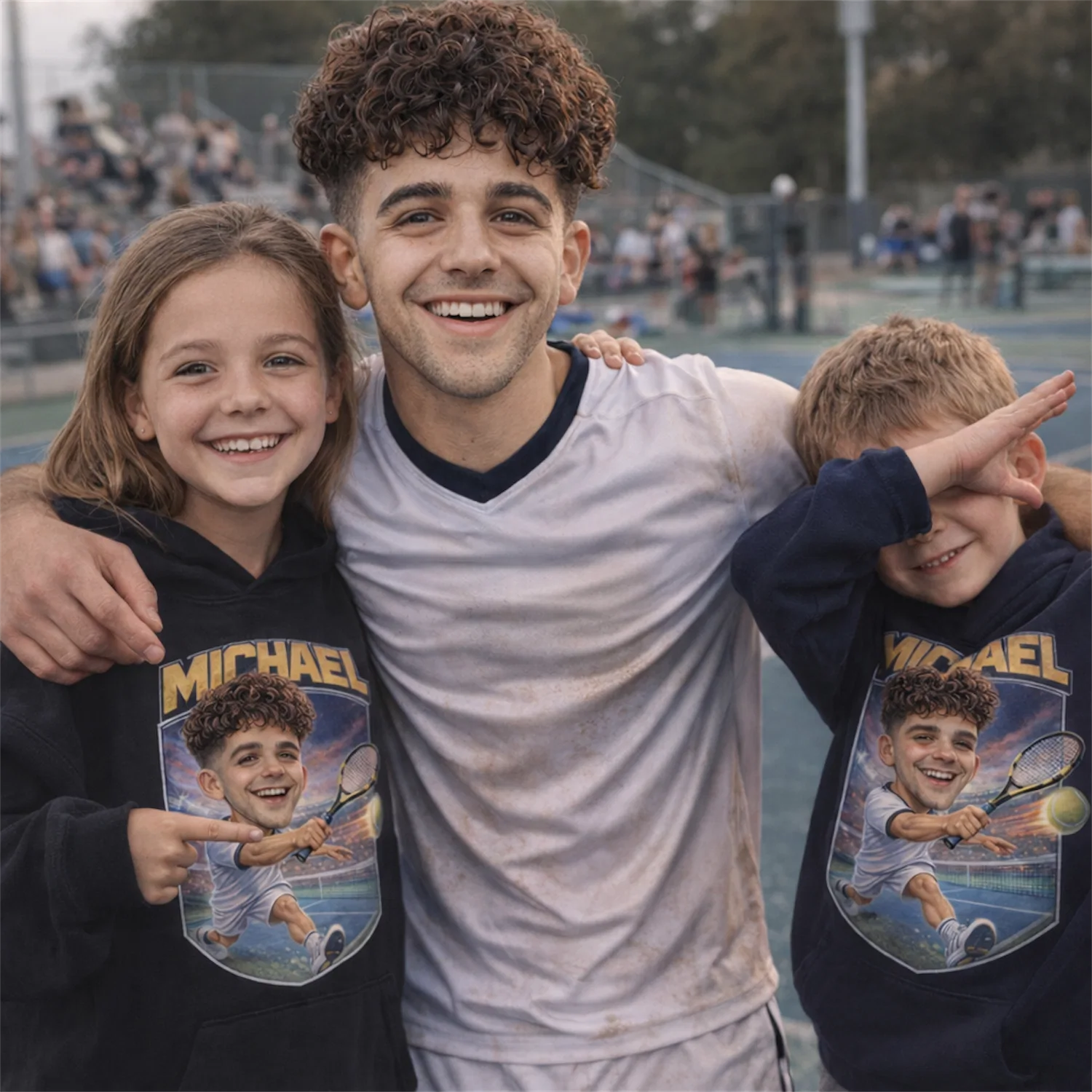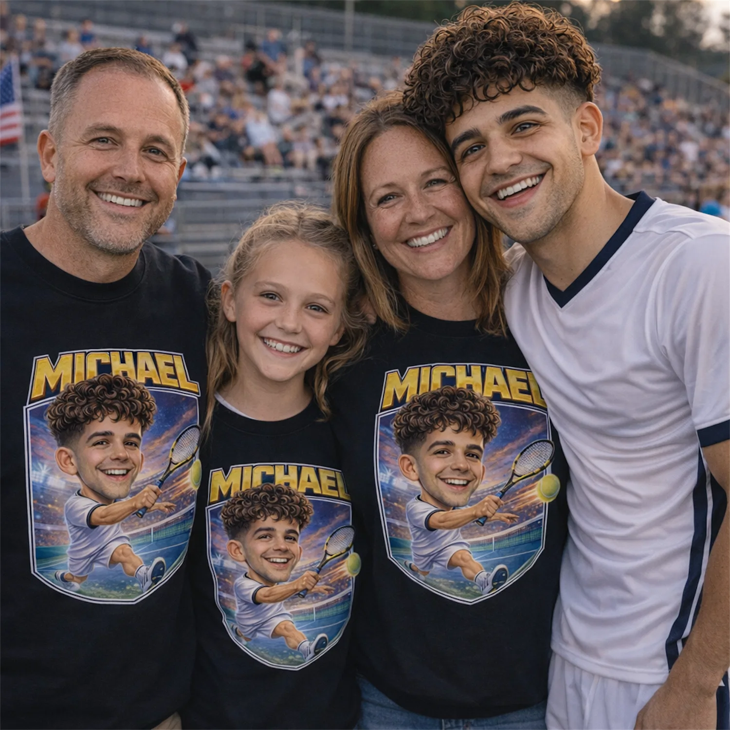 Mom who drove every Saturday morning, dad who tracked every match score, little siblings who sat on the bleachers with their rackets — everyone gets their own caricature version. Matching shirts for the whole family, each face different, same bold cartoon energy on tournament day.