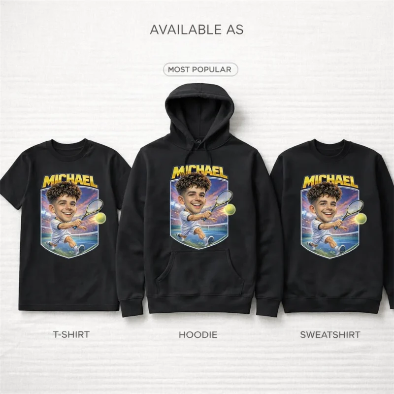 Upload a photo, pick your player’s name and court colors, and we turn your tennis player into a bold cartoon caricature printed on a soft cotton tee. That match point feeling, captured forever.
