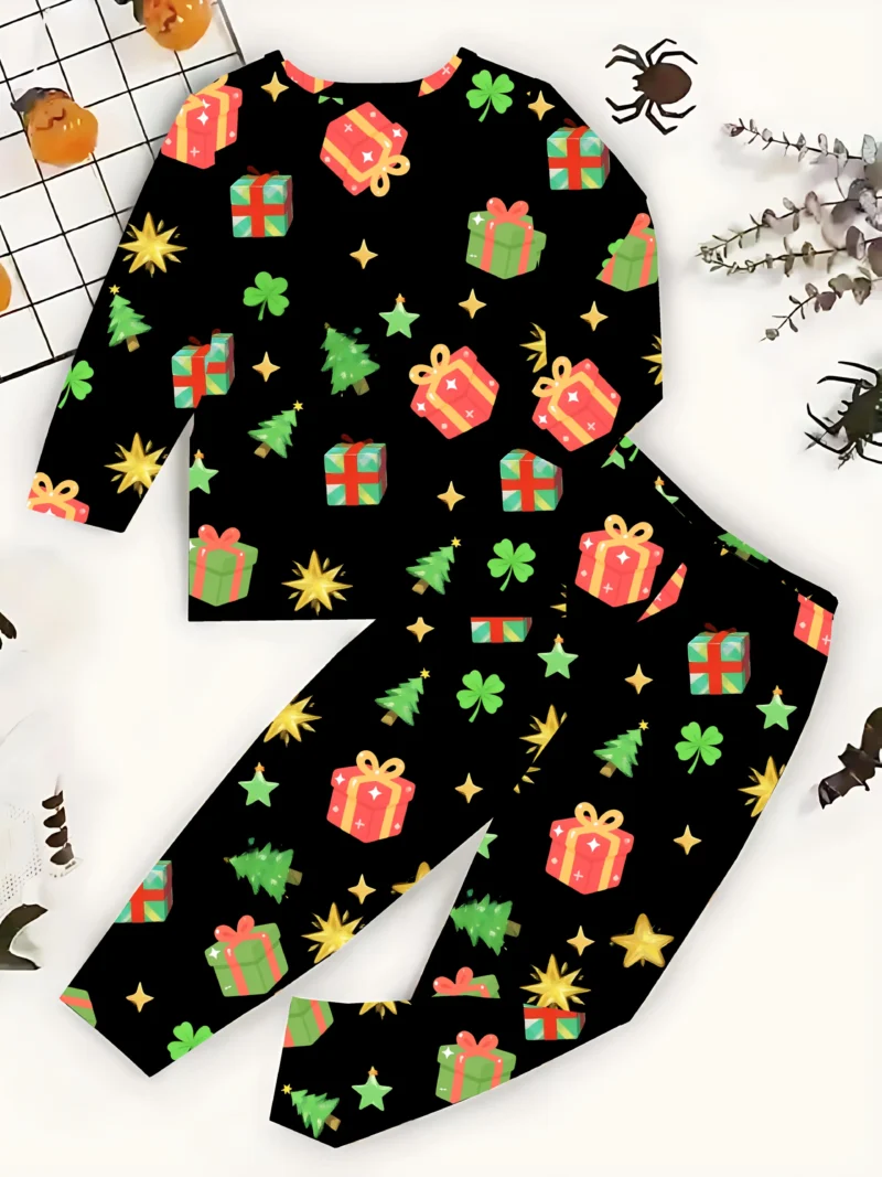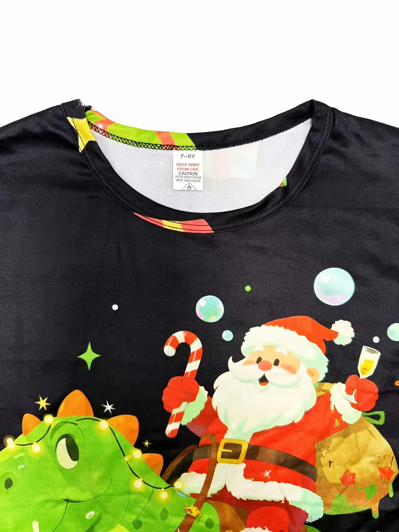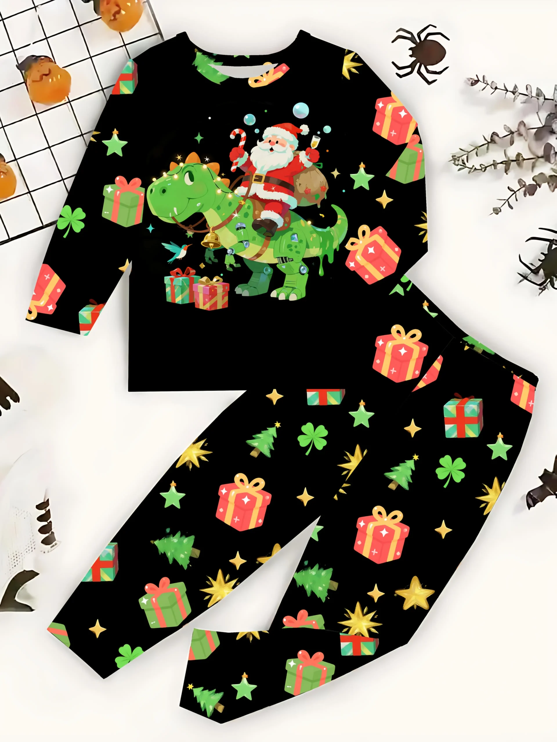 The pajamas showcase a vibrant all-over print of Santa Claus on a green T-Rex, surrounded by wrapped presents, Christmas trees, stars, and lucky clovers. The color palette blends classic holiday reds and greens with cheerful accents, creating a cozy and joyful vibe that pops in photos and videos.