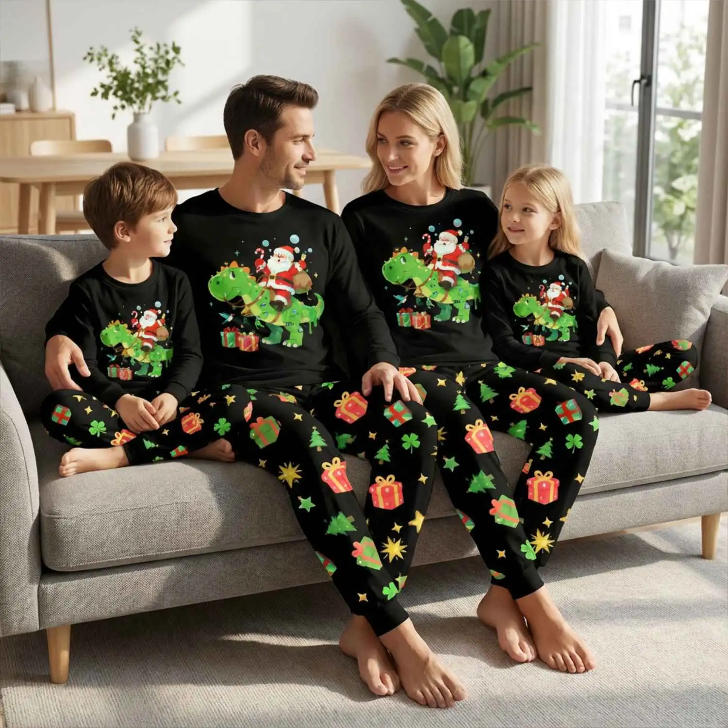 Make your Christmas morning unforgettable with these matching family pajamas featuring Santa riding a green dinosaur—a playful twist that brings laughter and warmth to your holiday traditions. Designed for families who love to stand out, this set is ideal for Christmas Eve lounging, festive photo shoots, and memorable gift exchanges.