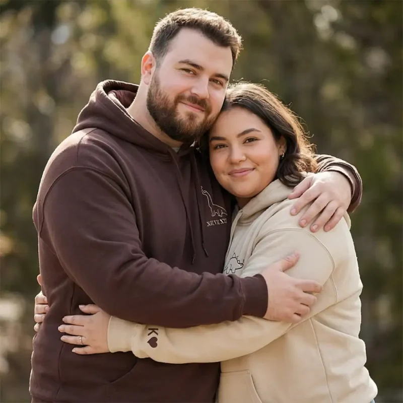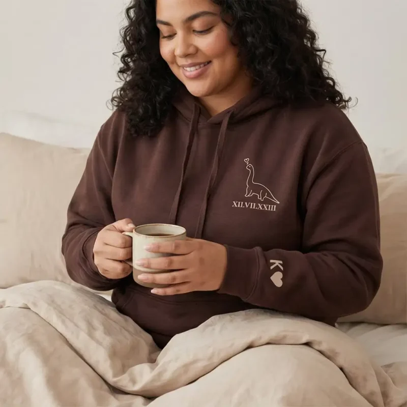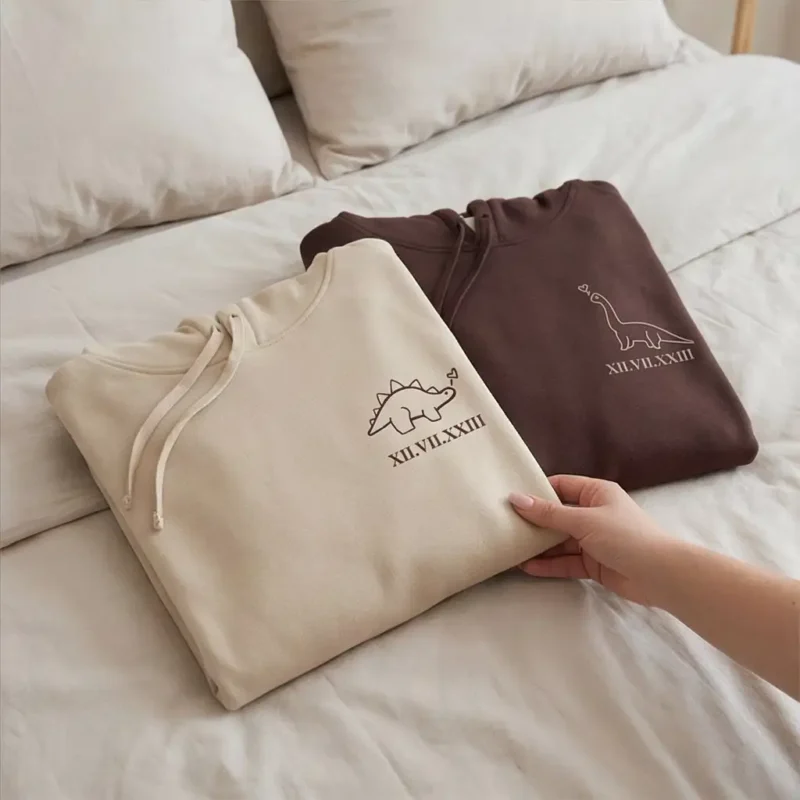 Show your love with the Dinosaurs Embroidered Matching Hoodie for couples. Featuring a stegosaurus or brontosaurus design with a heart and Roman numeral date, this cozy sweatshirt is a stitched memory of your bond. Personalize the sleeves with initials or custom text to make it unique. Perfect for anniversaries, Valentine’s Day, birthdays, or everyday wear. Available in multiple colors and sizes, this personalized hoodie is ideal for couples who want comfort, symbolism, and style.