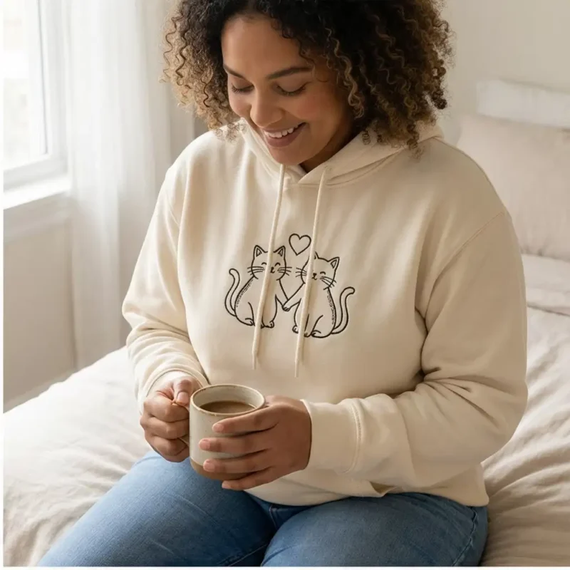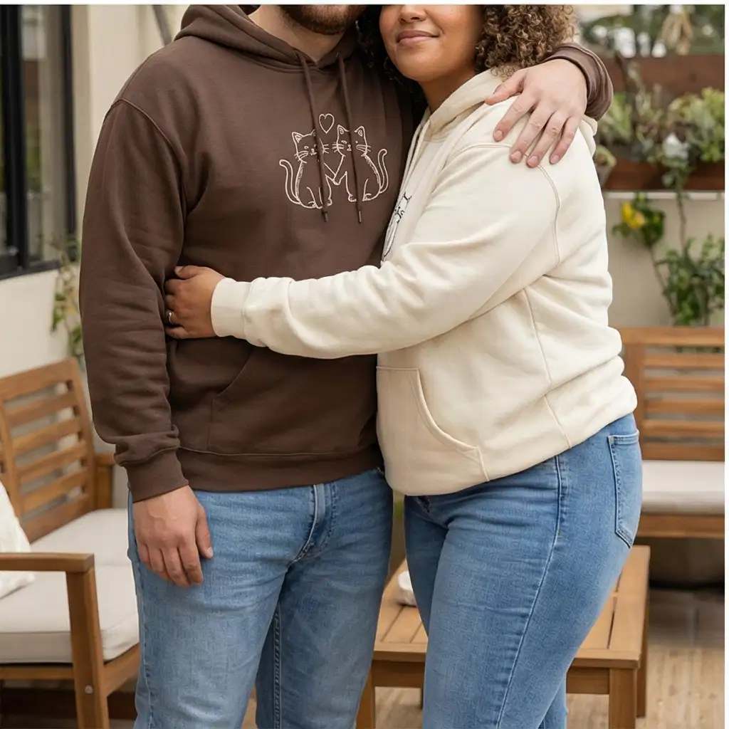 Celebrate your bond with a hoodie that speaks your story—featuring two embroidered cartoon cats sitting side by side, with a heart floating above them. Whether you choose the cream or brown variant, the design radiates warmth, affection, and playful charm. The cream hoodie showcases the cats holding paws, while the brown version keeps it subtle and sweet.