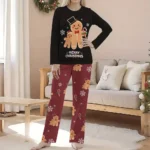 Gingerbread family pajamas with black tops and maroon pants for kids and adults