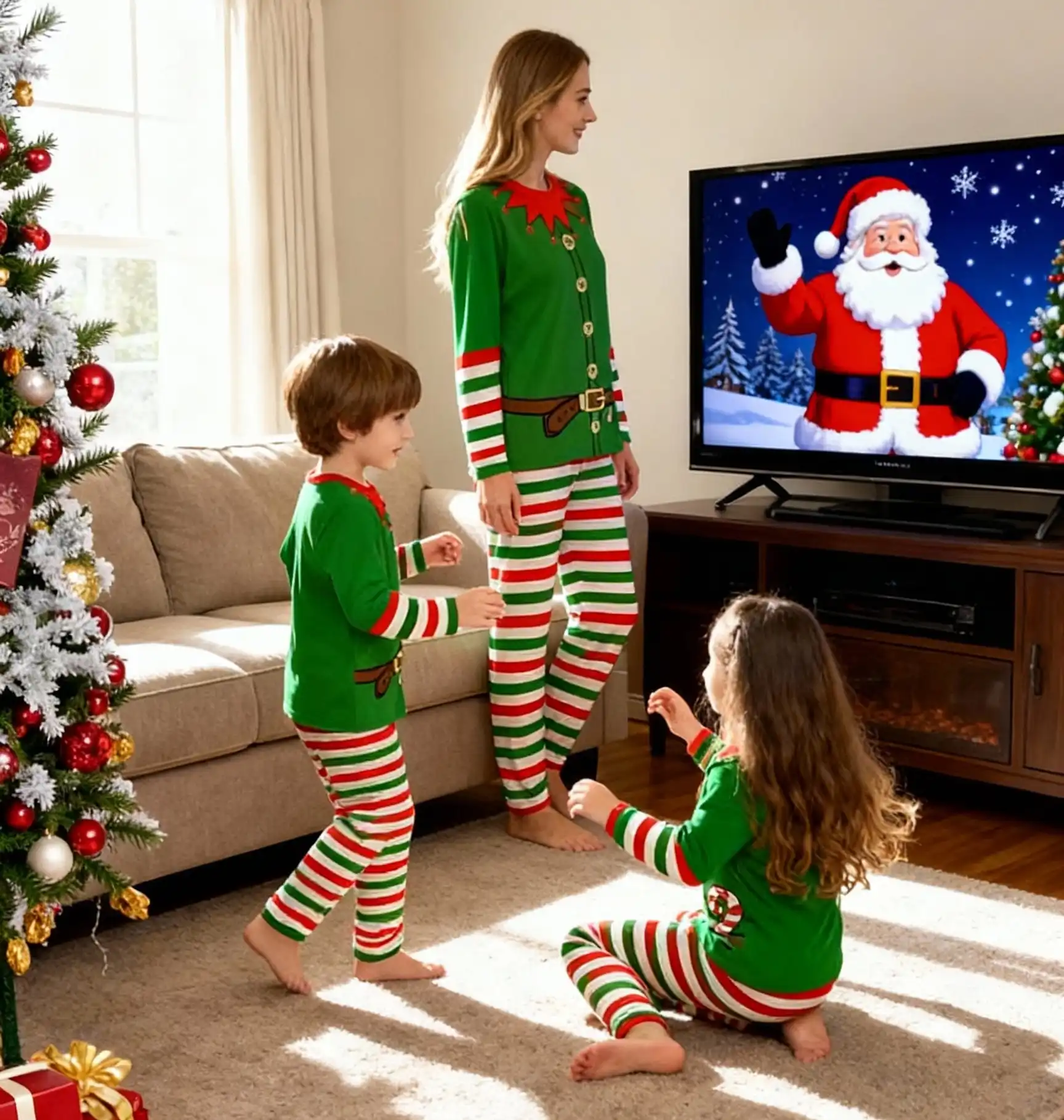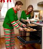 The set includes green tops with playful red collars and candy cane-striped pants in red, white, and green—instantly recognizable and ideal for holiday photos, gift openings, or lounging by the tree.