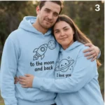 Celebrate love in style with these embroidered matching hoodies for couples. One hoodie features a smiling planet with “I love you,” while the other shows a rocket flying toward the moon with “to the moon and back.” Made from soft cotton blends, available in multiple colors and sizes, they’re cozy, durable, and perfect for everyday wear. Personalize the sleeves with initials, custom words, or phrases to make them truly unique. Ideal for Valentine’s Day, anniversaries, birthdays, or just-because surprises, these personalized sweatshirts are the ultimate romantic gift for lovers who want to wear their story. Keywords: matching hoodie for couples, embroidered couple sweatshirts, personalized sweatshirt, custom letters on sleeves.
