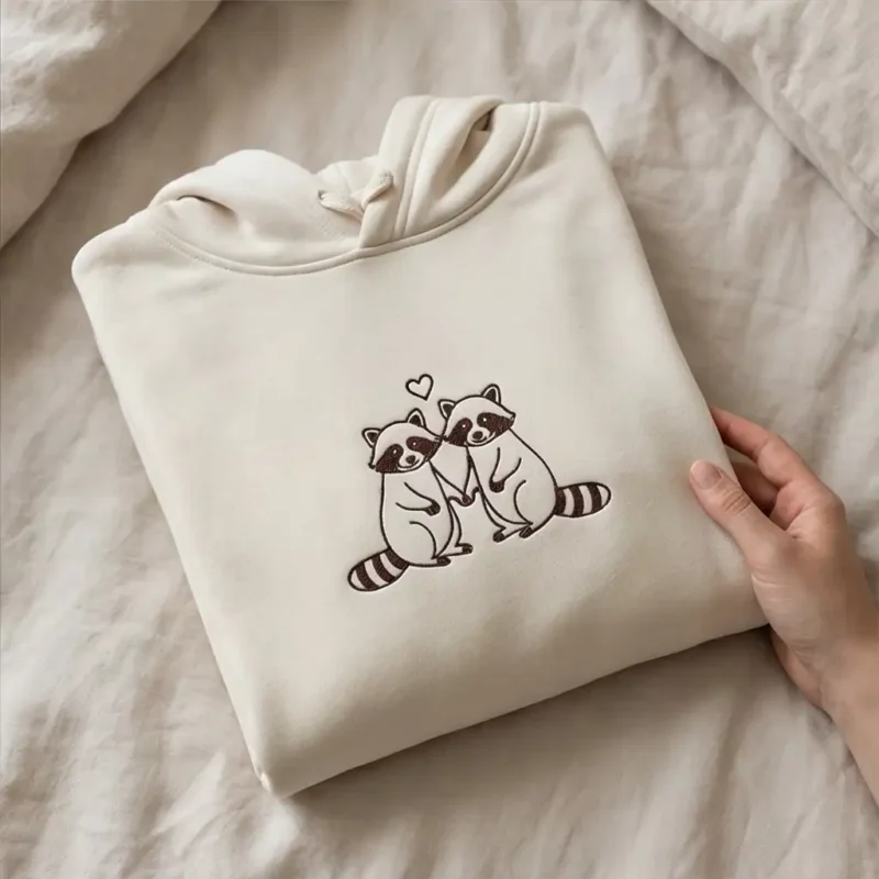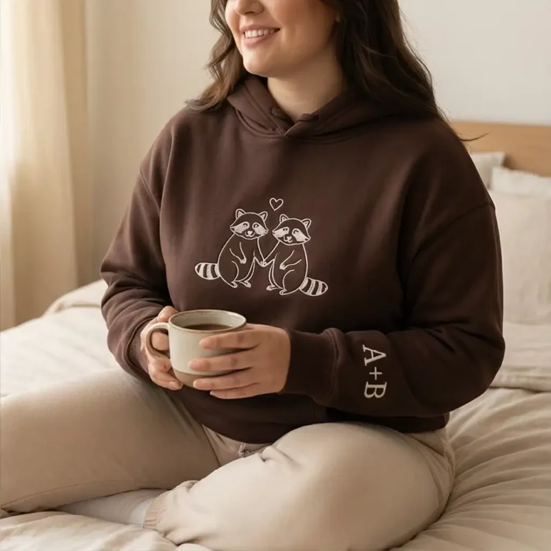 Raccoon Embroidered Matching Hoodie for Couples – Custom Initials Gift