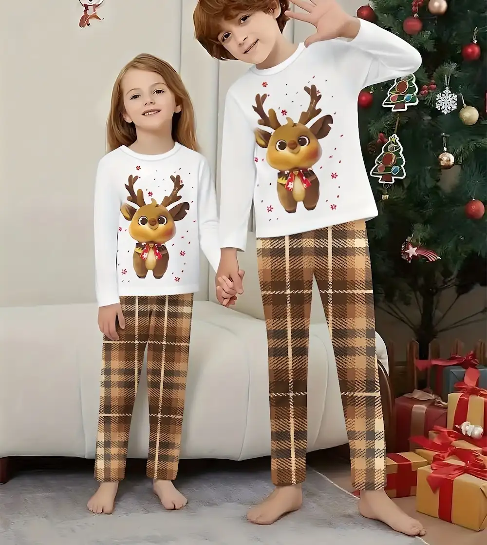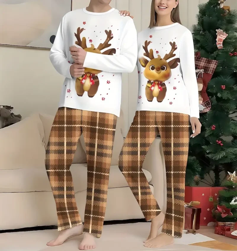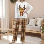Paired with brown plaid pajama pants, the set blends classic holiday charm with modern comfort.