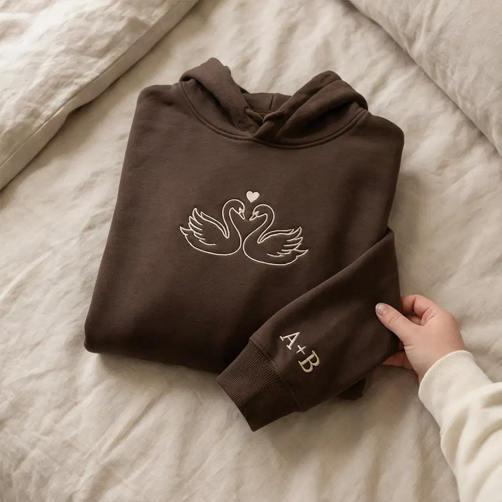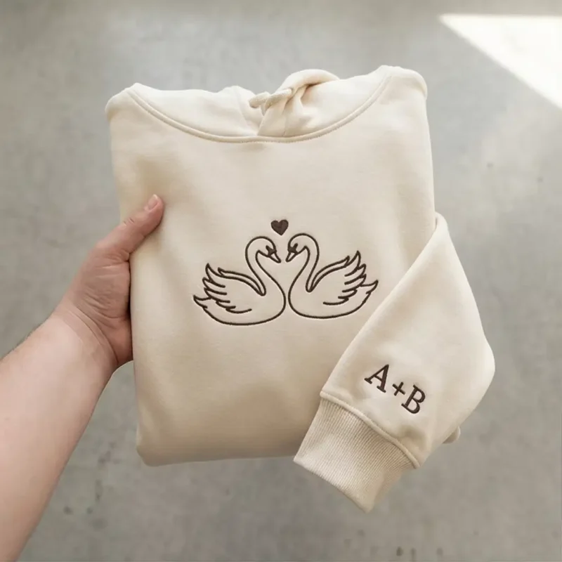 Swans embroidered matching hoodie for couples with custom initials. Romantic design, personalized sleeves, perfect Valentine’s gift.