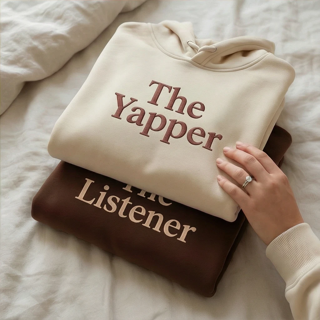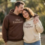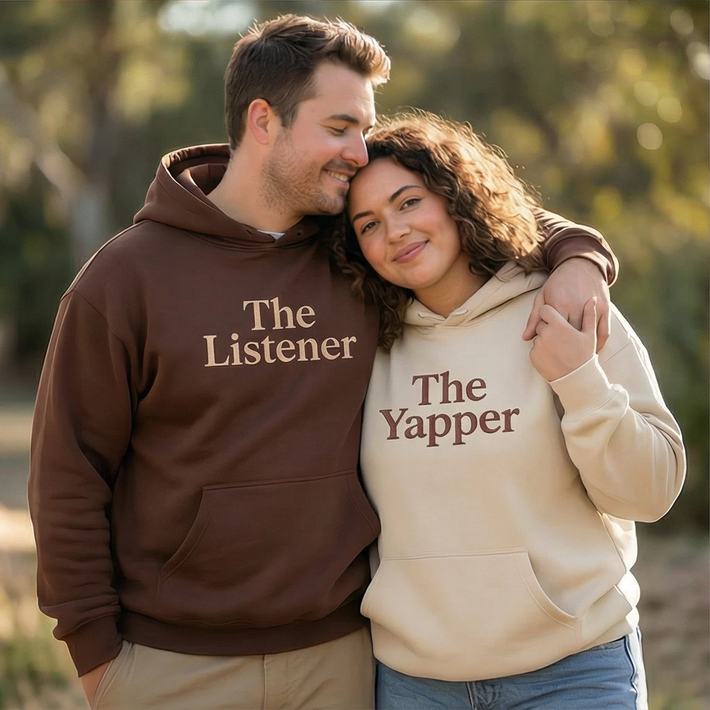 Celebrate your bond with The Yapper & The Listener funny matching hoodie for couples. Each hoodie features premium embroidery that highlights your dynamic — one for the talker, one for the listener. Made from soft, durable fabric, these embroidered hoodies are available in multiple colors and sizes, with the option to add custom initials or sleeve text for a personal touch. Perfect for couples who love matching hoodies, humor, and personalized fashion. A thoughtful gift for Valentine’s Day, anniversaries, birthdays, or cozy weekends, this set combines comfort, customization, and playful storytelling.